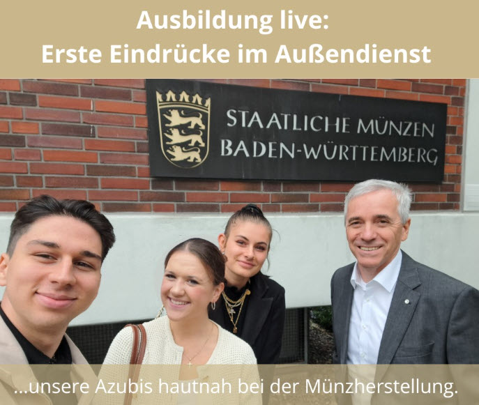 Gestern durften drei unserer kaufmännischen Auszubildenden unseren Außendienstmitarbeiter Jürgen Weissheimer zu einem besonderen Kundenbesuch bei der Staatlichen Münze Baden-Württemberg begleiten.