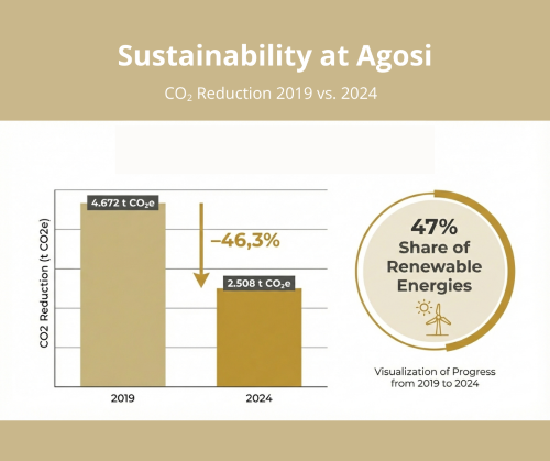 Thanks to our switch to green electricity, we have already made remarkable progress. In the base year 2019, our emissions were 4,672 tons CO₂e, while in the comparison year 2024 we achieved a reduction to 2,508 tons CO₂e – an impressive 46% savings.